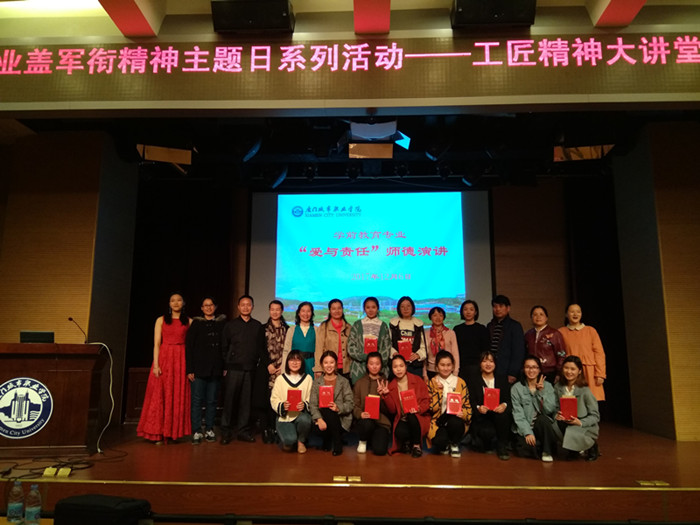在学校开展盖军衔精神主题日系列活动期间,学前教育系于12月6日晚上在会议中心举办了以“爱与责任”为主题的学前教育专业学生职业精神培养系列活动之“师德演讲”。党委委员、校长助理、教务处处长吴松青,来我校交流的临夏现代职业学院教育系主任苏华、副主任李静等应邀参加。学前教育专业2015级和2013级Z班的全体同学参加了活动。