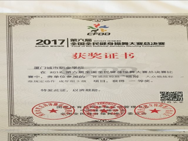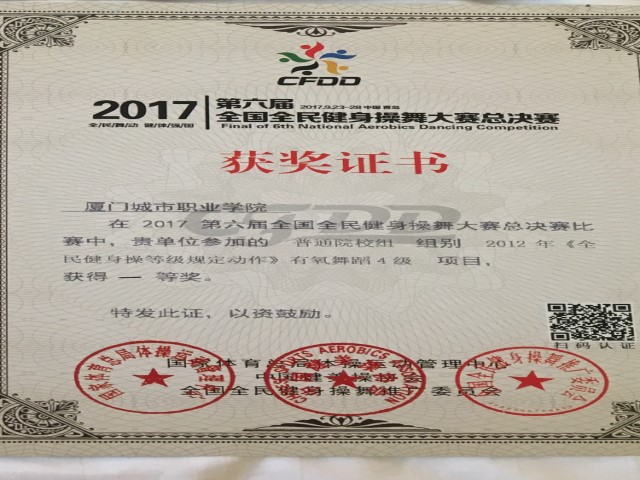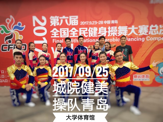 9月23日—28日,2017第六届全国全民健身操舞大赛总决赛在青岛市隆重举行。我校啦啦操队在体育教研部领队陈金义、教练陈东波的带领下,团结协作、奋力拼搏,荣获普通院校组别《全民健身操等级规定动作》有氧舞蹈4级和2级,以及大众锻炼标准规定动作成年组3级三个项目的一等奖。这是继今年6月我校啦啦操队勇夺福建赛区大学组有氧舞蹈4级和2级两项比赛冠军之后获得的又一殊荣。