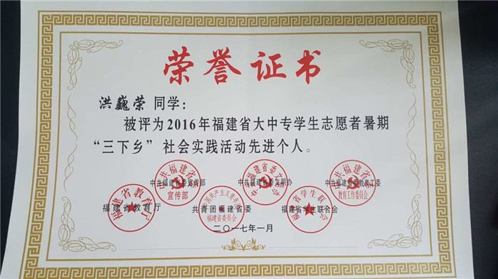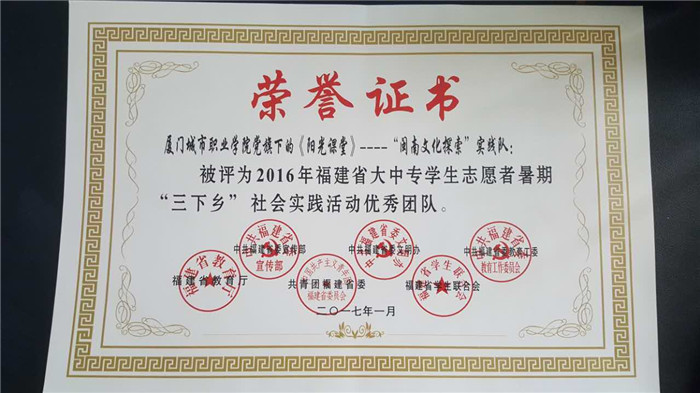 2016-2017学年,我校有近4000人次的青年志愿者参与了社区服务、暑期三下乡、支教扶贫、服务大型赛会、无偿献血等各项志愿服务活动。广大志愿者以团结协作的精神、真诚美好的微笑、周到细致的服务为学校赢得了声誉,也为青年大学生赢得了社会的广泛赞誉,展示了城院学子的良好形象,受到了社会各界的广泛好评,得到了有关部门和领导的充分肯定。其中,旅游系党旗下的《阳光课堂》——“闽南文化探索”实践队和洪巍荣同学分别被评为2016年福建省大中专学生志愿者暑期“三下乡”社会实践活动优秀团队和先进个人。