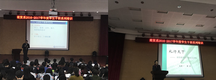 为进一步提升学生干部素质,建设一支具有较强执行力和服务能力的学生干部队伍,商贸系党总支开展了“红烛先锋行动”党员教师走进学生系列讲座暨商贸系2016-2017学年度学生干部培训会。