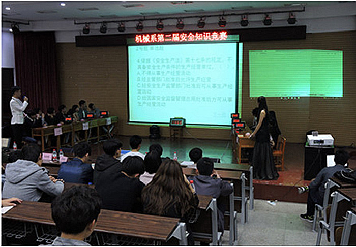 本次竞赛由必答题、安全主题海报讲解、抢答题、安全主题解说四个环节组成,并和前段时间机械系安全主题海报制作比赛有机结合。比赛素材和学生日常生活结合度高,现场选手、观众互动性强、氛围热烈、教育效果佳。