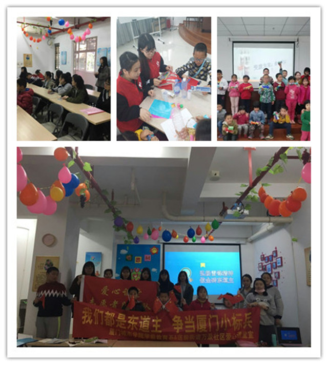 学前系前往滨水社区举行了“我们都是东道主,争当厦门小标兵”爱心课堂活动。通过金砖五国及金砖会议介绍、厦门文明礼仪宣讲、环保知识普及、雷锋的故事宣讲、废旧物品改造,提高了“小小东道主们”的社会责任感,激励他们更好地传承雷锋精神。