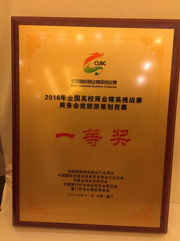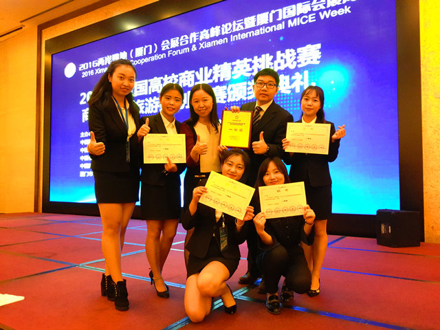 2016年全国高校商业精英挑战赛商务会奖旅游策划竞赛总决赛于11月7日至9日在厦门成功举办。经过激烈角逐,我校旅游系会展策划与管理专业的金蓉、孙文晶等同学组成的“魅燃团队”在吴小冰老师和林森老师的指导下,策划了以“播出精彩,明魅未来”为主题的会奖旅游方案,一路过关斩将进入总决赛争霸赛,并最终夺得一等奖。